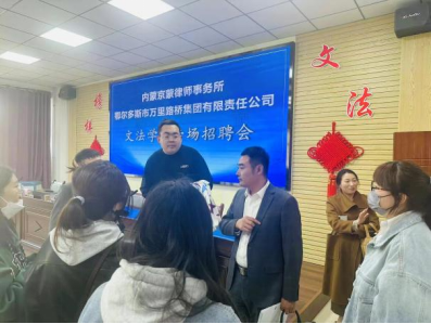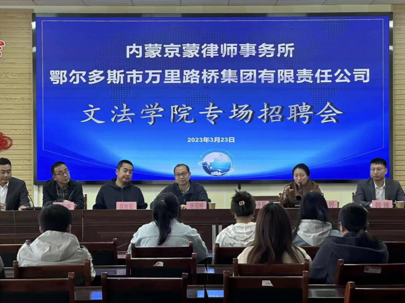 2023年3月23日下午,内蒙京蒙律师事务所和鄂尔多斯市万里路桥集团有限责任公司应邀在明德楼东A411举办法学、汉语言文学、和秘书专业的专场招聘会。内蒙京蒙律师事务所主任段普复、执业律师韩博,鄂尔多斯市万里路桥集团有限责任公司常务副总乔婷、经营副总高旭军一行到访太阳集团城娱8722。太阳集团城娱8722党委副书记兼副院长唐国桥、法学系副教授郝振明、毕业班班主任以及全体在校毕业生参加了此次招聘会。