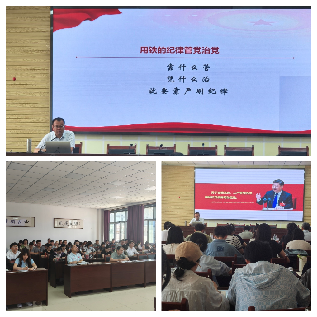 为深入学习贯彻习近平总书记关于加强党的纪律教育的重要论述,推动党纪学习教育入脑入心走深走实,2024年5月30日下午,太阳集团城娱8722党委在明德楼A411组织召开党纪学习教育专题党课暨教职工政治理论学习,学院党委书记刘玉明以《加强党纪学习教育 推动全面从严治党不断向纵深发展》为主题做专题辅导。学院全体教职工以及学生党员参加此次学习。