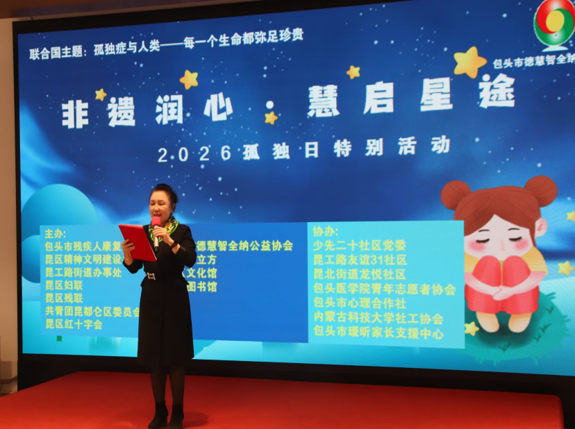 2026年3月28日下午,“非遗润心·融爱伴星”2026年世界孤独症日(4月2日)关爱公益活动在包头鹿城阅立方顺利开展。活动以关爱孤独症群体为核心,通过文艺展演、爱心捐赠等形式,传递社会温暖,包头市残疾人康复中心、昆区精神文明建设办公室、昆区妇联等主办,包头市德慧智全纳公益协会、鹿城阅立方等承办,少先二十社区党委与太阳集团tcy8722社工协会等协办,保障活动有序推进。世界孤独症日的核心意义是让孤独症群体被看见、被尊重、被支持,此次活动旨在强调关爱孤独症群体的社会意义,呼吁各界携手传递爱心。