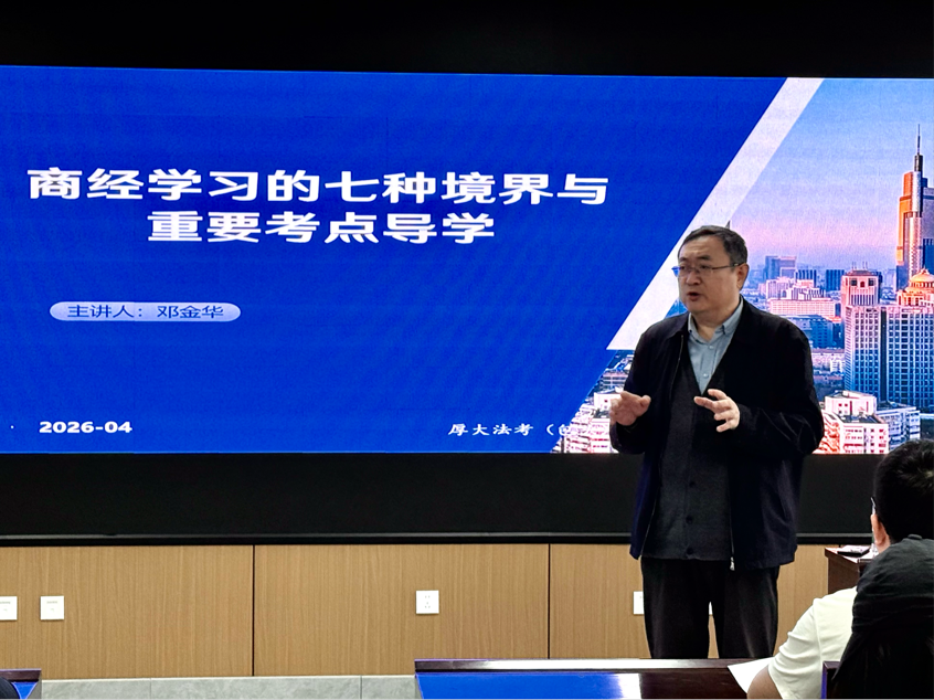 讲座以“商经学习的七种境界与重要考点导学”为主题,邓金华老师以古典诗词为引,将商经法学习拆解为“独上高楼—区分”“为伊憔悴—顺位”“庐山烟雨—回归”等七大境界,用生动易懂的方式拆解复杂法条与考点逻辑。同时,他围绕商法五大基本原则等核心内容,结合法考命题趋势,系统梳理了商经法的备考重点、学习方法与时间规划,既传授了区分思维、顺位思维、回归思维等应试技巧,也分享了在学习中探寻乐趣的心得,为同学们搭建了清晰的备考框架,破解了备考迷茫。