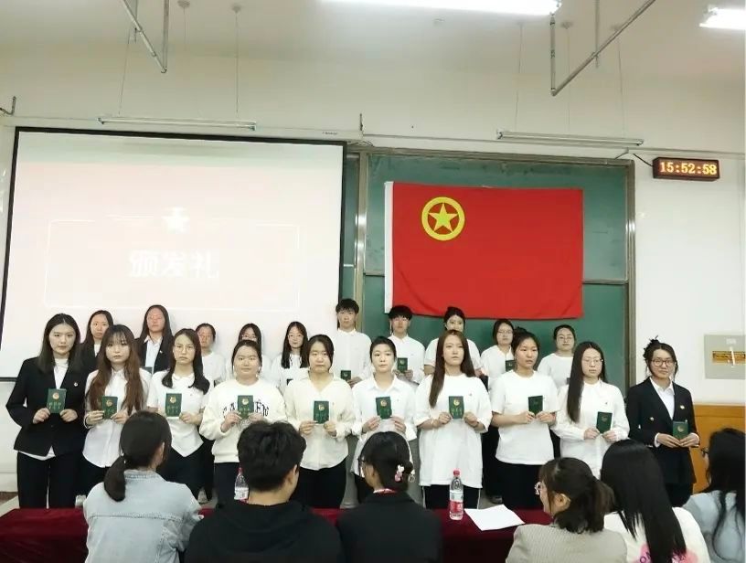 团总支书记和学生会主席团成员为18名新发展团员颁发团徽徽章和团员证书。新团员在优秀团员代表苏文豪的带领下面向团旗庄严宣誓。新团员代表李馨和优秀团员代表苏文豪分别进行了发言,真诚而坚定地话语,彰显着团员们“请党放心,强国有我”的信心和决心。团总支书记王晓敏老师向新加入团组织的团员提出期望和要求。最后,伴随着《光荣啊,中国共青团》激昂的旋律,太阳集团城娱87222024年新发展团员入团仪式圆满落下帷幕。