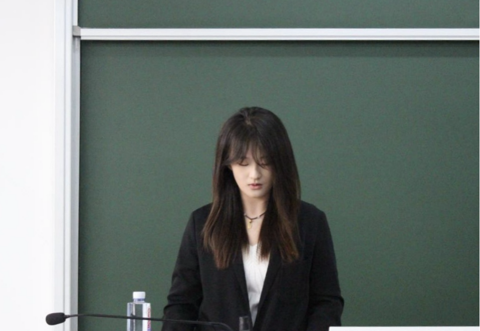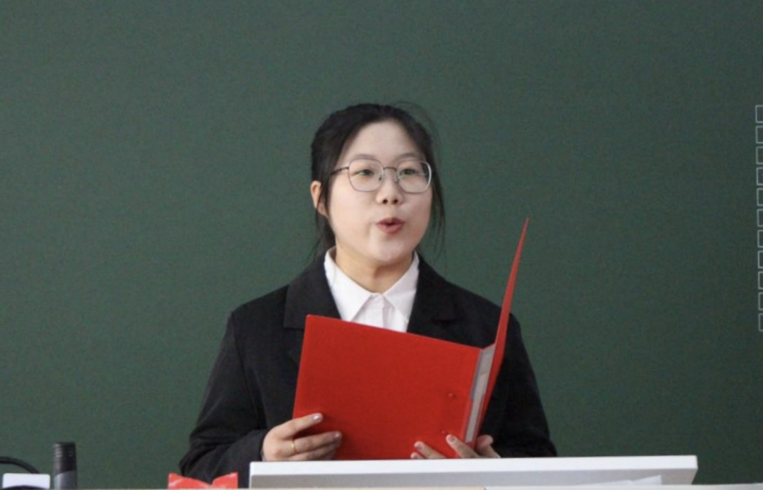第三项议程,第三十四期团课新学员代表张琳喧发言。她满怀热忱地表达了全体新学员珍惜学习机会、积极提升自我、主动向团组织靠拢的坚定决心,展现出新时代文法青年朝气蓬勃、勇于担当的精神风貌。