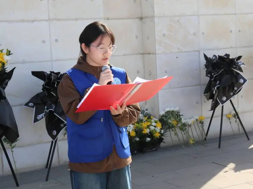 国歌唱毕,全场肃立,向革命先烈默哀三分钟。在场师生在静默中追思英烈功绩,寄托深切哀思,用最朴素的方式向英雄壮举致以最崇高的敬意。默哀结束后,党员和团员代表怀着崇敬之心上前,向烈士纪念碑敬献鲜花,朵朵鲜花承载着对英烈的无限哀思与崇高敬意。