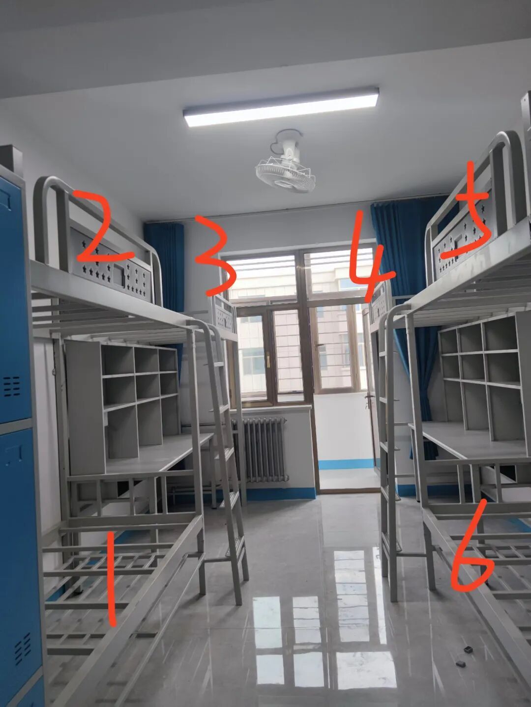六人间宿舍床位划分参考图如下,请各位同学按照床位安排入住: