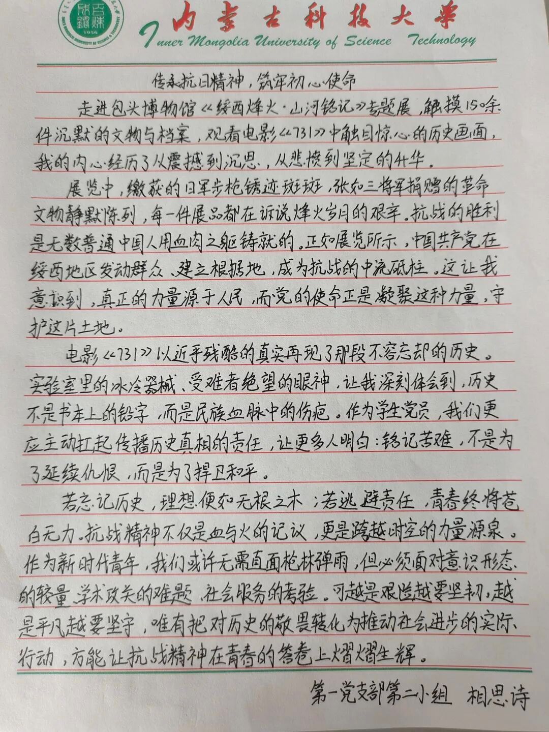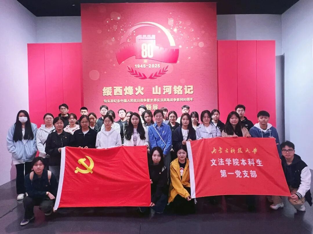 为纪念中国人民抗日战争暨世界反法西斯战争胜利80周年,深刻缅怀革命先烈,传承伟大抗日精神,太阳集团城娱8722本科生第一党支部于2025年9月28日组织开展了以“传承抗日精神,筑牢初心使命”为主题的党日活动。支部成员集体参观包头博物馆“绥西烽火·山河铭记”专题展,并观看重大历史题材影片《731》。
