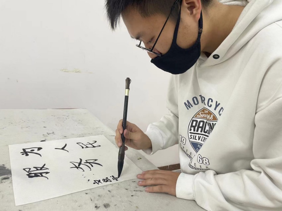 活动开始后党支部全体党员首先集体进行红色经典诵读——《共产党宣言》,之后在书法协会同学得现场指导下,党员们挥毫泼墨,书写红色经典名句、习语金句、党的奋斗目标等内容。