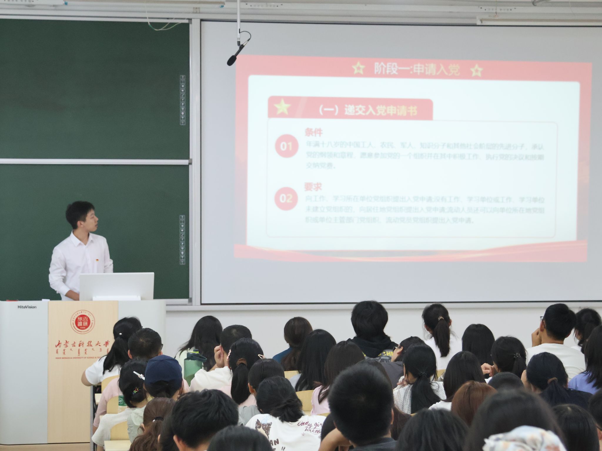 随后,孙洪昊同志详细解读入党流程。将其拆解为申请入党、积极分子培养教育、发展对象考察、预备党员接收及转正五个关键阶段。结合实际操作中的常见问题,明确各阶段时间节点、材料要求与注意事项,让新生对入党步骤有清晰、可遵循的认知。孙洪昊同志还向新生们介绍了党支部基本情况,内容涵盖组织结构、工作内容及具体实践活动。