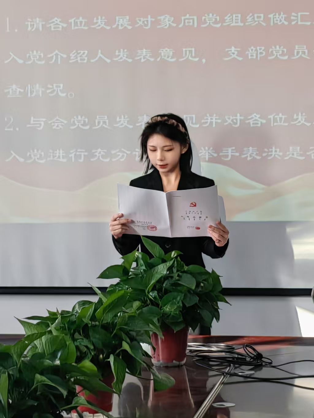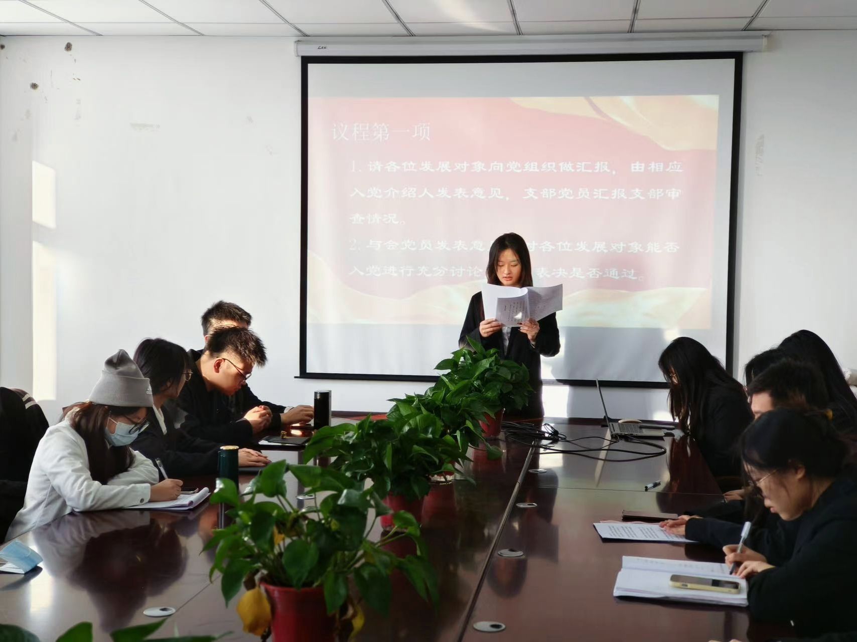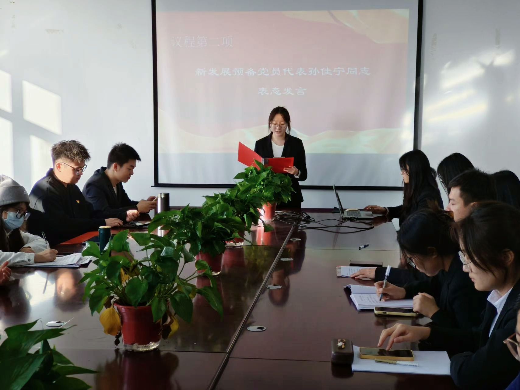 大会在庄严的国歌声中拉开帷幕。党支部书记张国栋首先汇报会议出席情况,确认正式党员人数符合表决要求,会议程序符合规定。随后,马宇飞等14名同志依次汇报思想与学习情况,入党介绍人发表意见,支部党员汇报审查结果。经与会党员投票表决,14名同志均全票通过,顺利被接收为中共预备党员。紧接着,预备党员代表孙佳宁发言,她承诺将以党员标准严格要求自己,持续加强理论学习与实践锻炼,努力成长为一名合格的共产党员。支部书记宣读接收决议,为预备党员佩戴党徽。