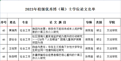 根据《太阳集团tcy8722优秀博(硕)士学位论文评选及奖励办法》(内科大发〔2021〕41号)等文件要求,经本人申请、导师推荐、学院初选,并由校第30届博硕士学位评定委员会第二次会议评审通过,社会工作硕士教育中心2023届毕业生共有4篇学位论文获评2023年校级优秀硕士学位论文。分别是由侯荣庭副教授指导,黄娟秀同学撰写的《挽回与发展:附条件不起诉未成年人观护帮教的个案工作介入研究》、邵会会同学撰写的《社区困境儿童家庭监护能力提升的行动研究——以H市“人在暖途”困境儿童保护保障项目为例》、王怡贺同学撰写的《自由与责任:存在主义视角下女性大学毕业生职业同一性建构路径研究》和由孙秀丽副教授指导,张自明同学撰写的《多囊卵巢综合症患者婚恋信心重构的个案工作介入研究》。