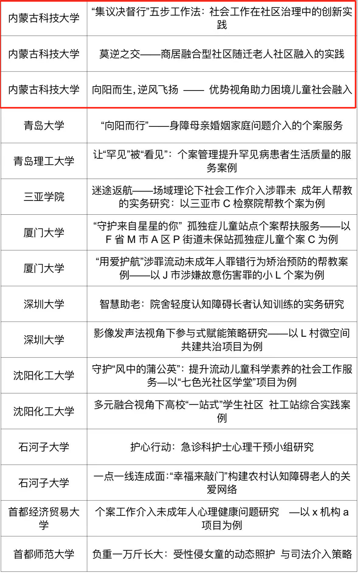 由王蕾老师指导,韦翠香、张晓、商宇泽、付祖英、李婷婷同学申报的案例《向阳而生、逆风飞扬——优势视角助力困境儿童社会融入》入围全国百强。