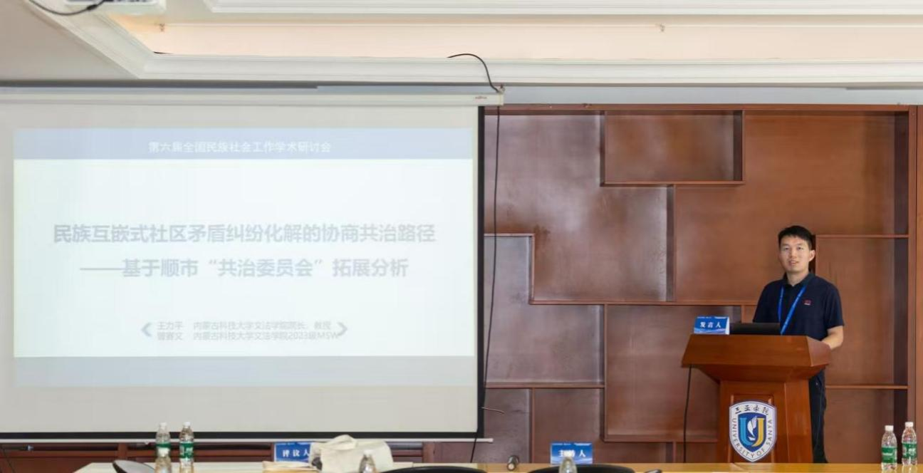 本次研讨会聚焦民族社会工作在铸牢中华民族共同体意识中的挑战与机遇、民族社会工作理论创新与实践路径、民族地区社会工作服务模式与经典案例分析、民族社会工作与民族地区社会治理创新策略、民族社会工作教育与人才培养体系构建等核心问题展开讨论。我院王力平教授与社会工作硕士研究生曾赛文同学合著的论文《民族互嵌式社区矛盾纠纷化解的协商共治路径——基于顺市“共治委员会”拓展分析》在“民族社会工作与民族地区社会治理创新策略”分论坛上进行了分享,并与专家学者进行充分探讨。