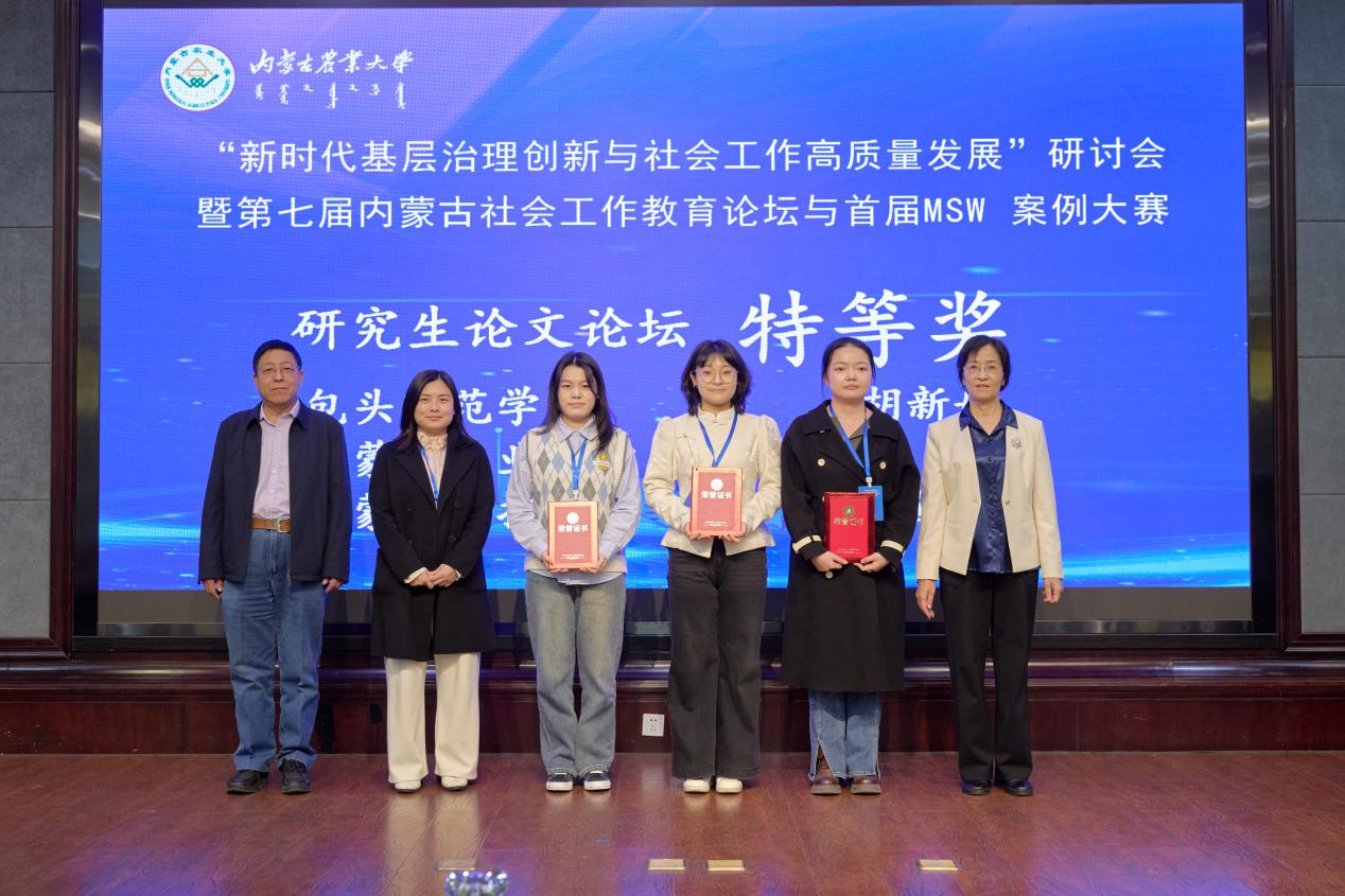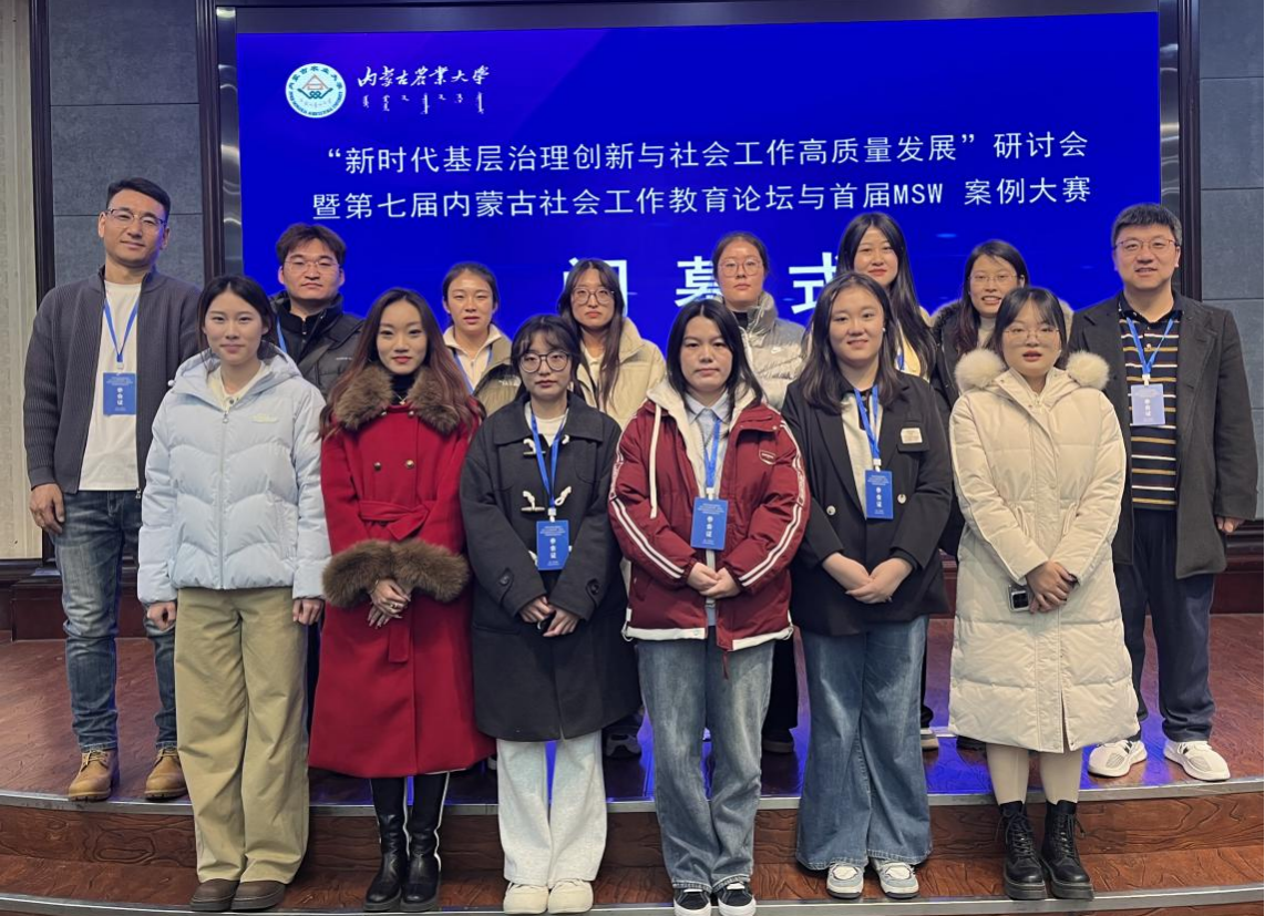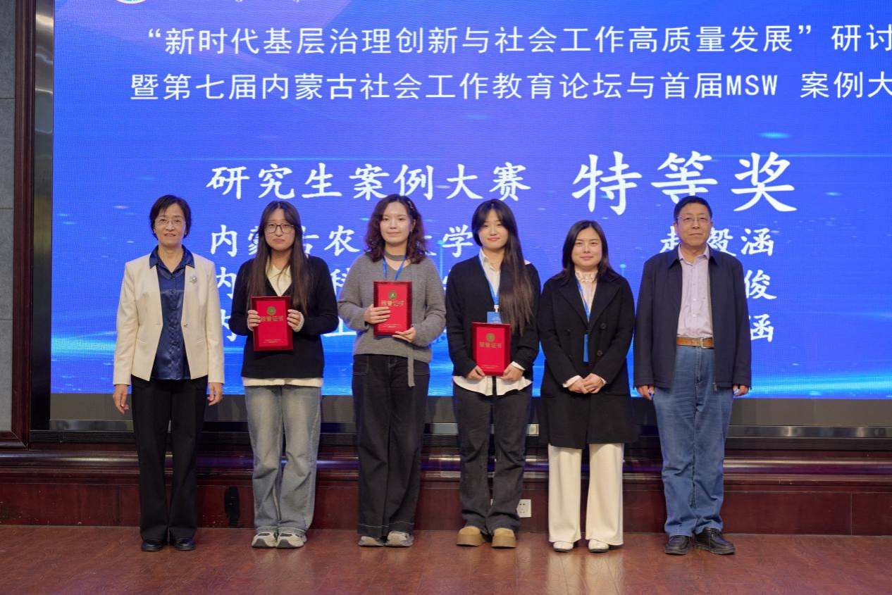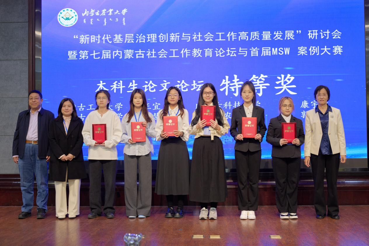2025年11月21日,由内蒙古社会工作协会、内蒙古社会工作高校联盟主办,内蒙古农业大学人文社会科学学院承办,美亚联创(北京)科技有限公司协办的“新时代基层治理创新与社会工作高质量发展”研讨会暨第七届内蒙古社会工作教育论坛与首届MSW案例大赛在呼和浩特市隆重召开。全区9所设有社会工作专业高校的近百名专家学者和学生齐聚青城。我校太阳集团城娱8722社会工作系侯荣庭副教授、张瑞博士、哈那嘎尔博士、程晨博士与12名社会工作专业学生组成代表队应邀参会,师生团队在学术交流与赛事评选中均表现突出,一举夺得10项大奖,包括特等奖3项、一等奖4项、二等奖3项,实现成绩与影响力的双丰收,充分彰显了我校社会工作专业人才的雄厚实力与培养质量。